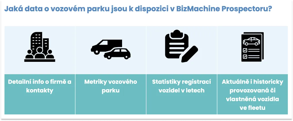 Všechna tato data nabízí BizMachine ve svém online nástroji Prospector. Jeho obsluhu zvládne každý, kdo už někdy použil online vyhledávání. Všechna data jsou dostupná na jeden, maximálně dva kliky. Obchodní konzultanti a datový analytici z BizMachine navíc ty nejčastější způsoby filtrace a segmentace firem ukládají do takzvaných aktualizovaných seznamů příležitostí. Na jeden klik tak můžete najít už předchystaný výběr firem, které například mají určitý objem osobních či užitkových vozidel starší 4 a více let. Když si vyrobíte nějaký vlastní seznam, můžete si ho snadno uložit, nebo stáhnout k sobě do počítače. Prostě není třeba žádných speciálních dovedností a všechna data máte na dosah ruky!