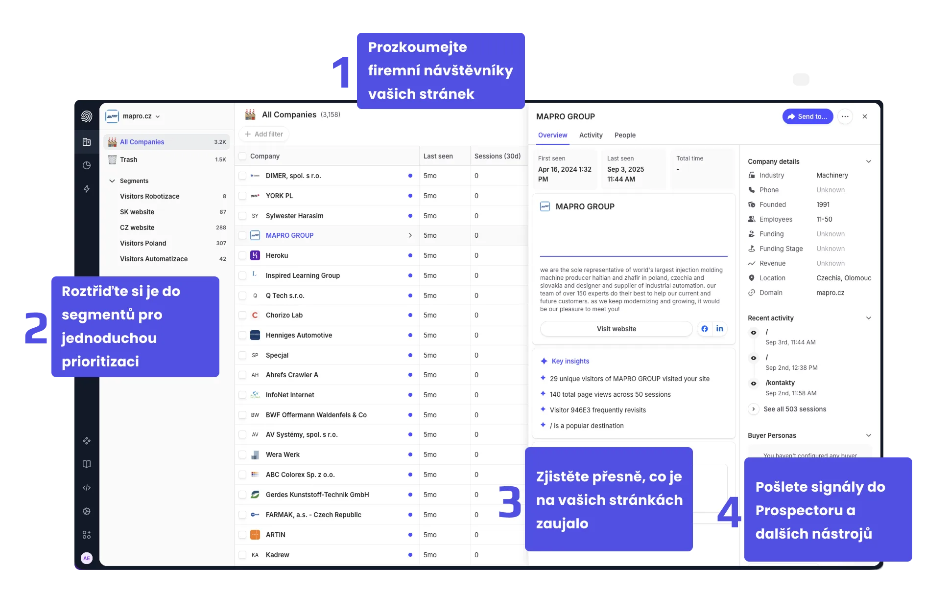 ⮕ U každé firmy vidíte přesnou historii návštěv, jak se na váš web dostali, a které stránky je zaujaly.