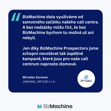 Miroslav Surovec začal spolupracovat s BizMachine krátce po založení JM-Call, když hledal způsob, jak rychle a efektivně oslovovat relevantní kontakty. „Díky doporučení jsme oslovili pana Střechu z BizMachine. Hned na první schůzce nám představil možnosti, které jsme mohli využít, a první kampaň jsme spustili už během několika dnů. Potřebovali jsme oslovit finanční poradce a makléře, a BizMachine nám dodali perfektně vyfiltrovanou databázi,“ vysvětluje Miroslav. Od té doby JM-Call rozvíjí svou databázi kontaktů a rozšiřuje své služby díky možnostem, které Prospector z BizMachine nabízí.