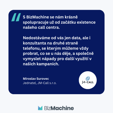JM-Call, dynamicky rostoucí call centrum, se od svého počátku opírá o moderní nástroje, které jim umožňují efektivně oslovovat potenciální klienty i navolávat kampaně pro koncové zákazníky. V rozhovoru s Miroslavem Surovcem, jednatelem společnosti, jsme měli možnost nahlédnout, jak BizMachine data významně přispívají k úspěchu jejich podnikání.