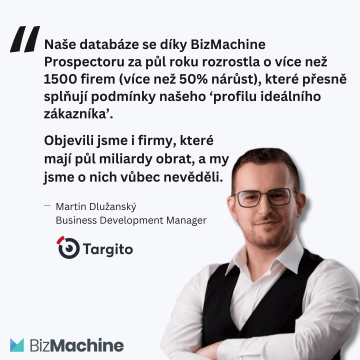 Targito na českém trhu vytváří datovou platformu (CDP) pro podporu personalizované komunikace a cílení reklamy, převážně v e-commerce sektoru. Svým zákazníkům pomáhá propojit data a vytvořit tak relevantní kampaně. I ke svému fungování a růstu na trhu však potřebují kvalitní a úplná data, a proto minulý rok začali využívat BizMachine Prospector. Jak uvádí Martin Dlužanský, Business Development Manager v Targitu, díky Prospectoru má jeho tým dokonale zmapovaný celkový potenciální trh.