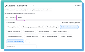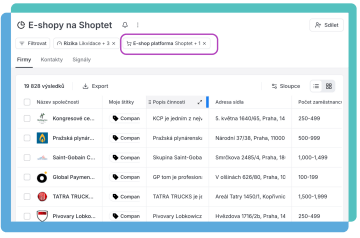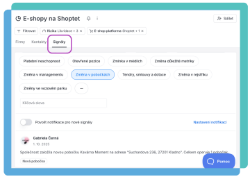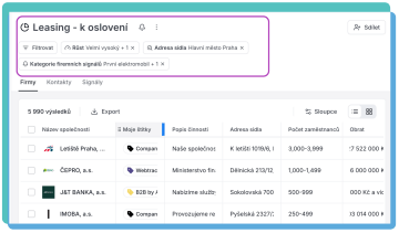 Ať už hledáte firmy, které otevírají nové provozovny, spouštějí e-shopy, přidávají vozy do flotily, čerpají dotace nebo mění vlastnickou strukturu – v BizMachine je snadno najdete. Firmy napříč pěti trhy (CZ, SK, PL, DE, HU) můžete třídit podle parametrů odpovídajících vašim produktům: obrat, počet poboček, právní forma, typ podnikání nebo aktuální změny ve firmě. Najdete tak přesně ty klienty, kde má vaše nabídka největší šanci uspět.