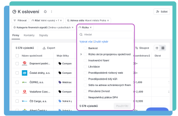 | Firma se dostává do potíží | Sleduje negativní signály: insolvence, exekuce, pokles aktivity | Včas zareagovat a ochránit úvěrové portfolio |